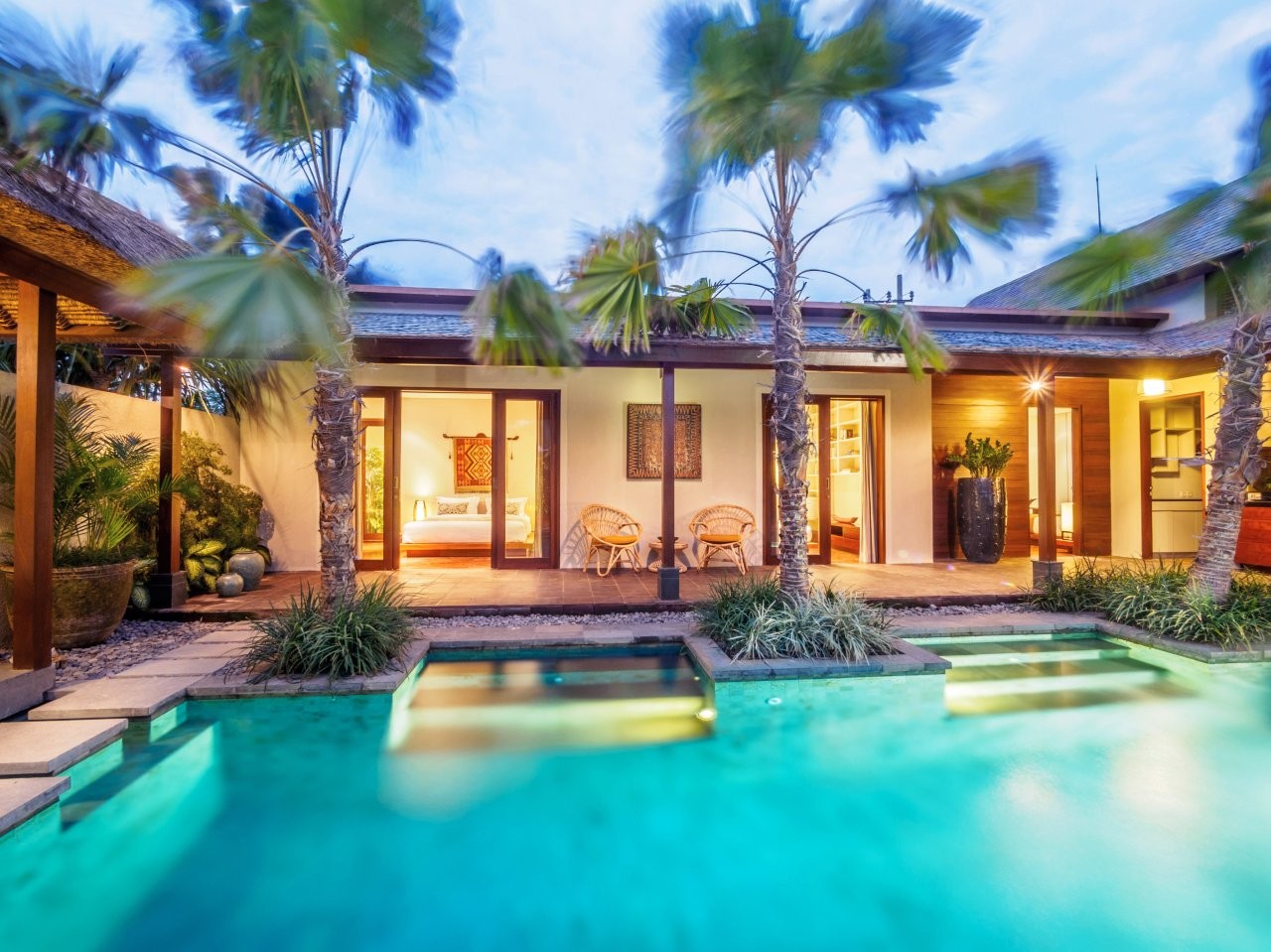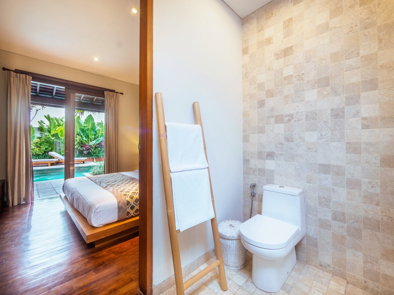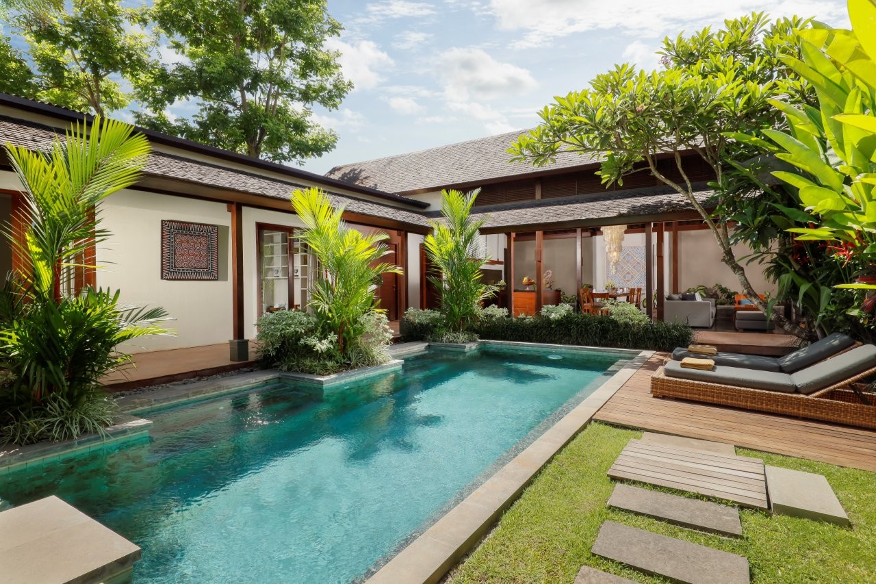Outdoors, a private pool is framed by lush greenery, with quiet spots perfect for sunbathing or simply unwinding. A fully equipped kitchen makes preparing meals easy, while daily breakfast service in the villa adds a touch of indulgence to your stay.