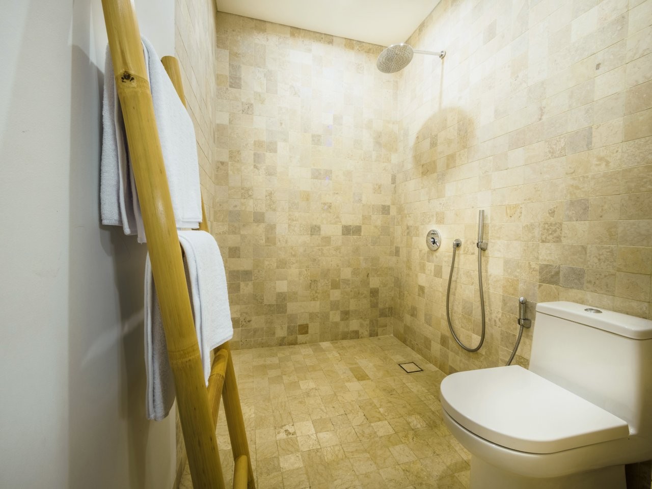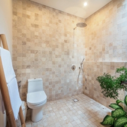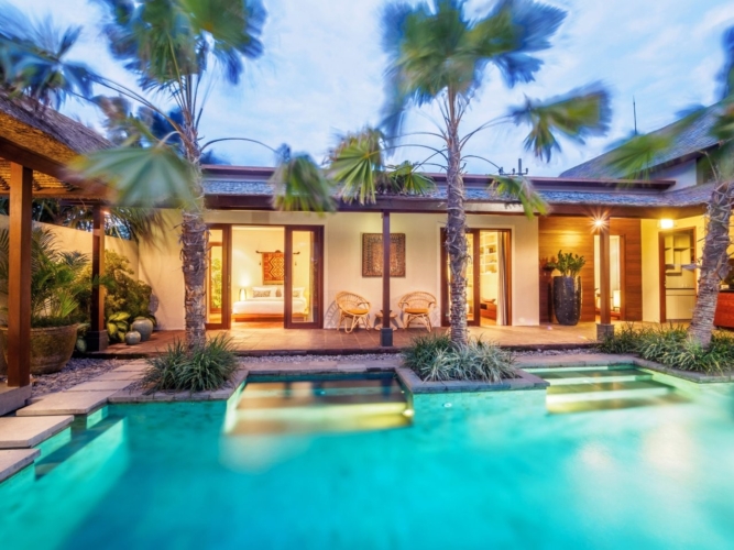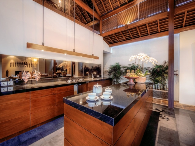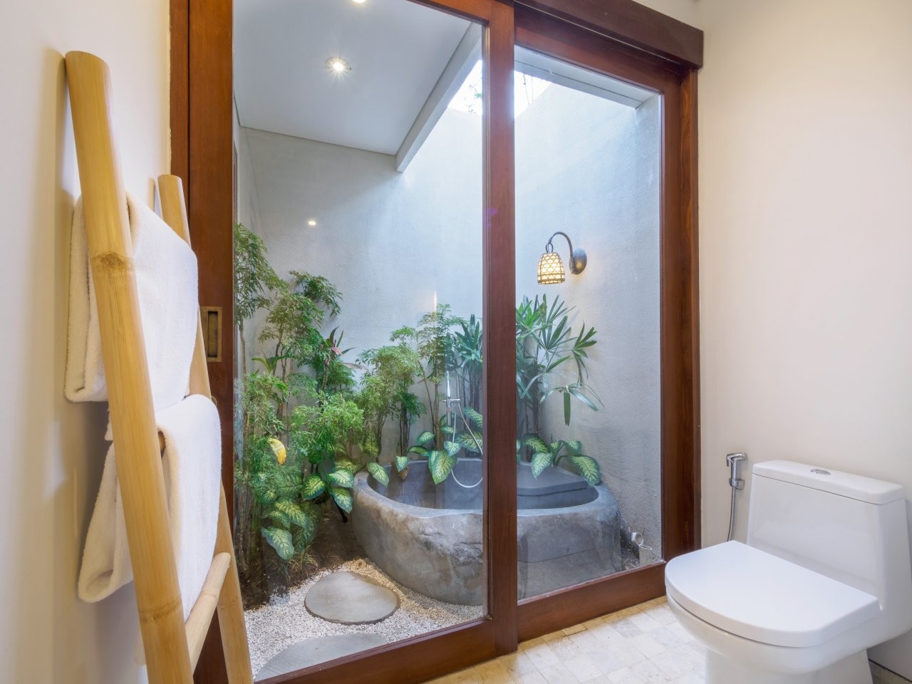 Outdoors, a private pool is framed by lush greenery, with quiet spots perfect for sunbathing or simply unwinding. A fully equipped kitchen makes preparing meals easy, while daily breakfast service in the villa adds a touch of indulgence to your stay.