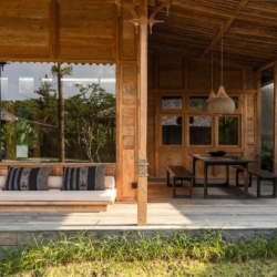The villa opens into a spacious open-plan living area, where natural materials, handcrafted wooden details, and soft tropical hues create a soothing ambiance. A generous lounge with built-in seating and a large dining table encourages relaxed gatherings, shared meals, and unhurried moments together.