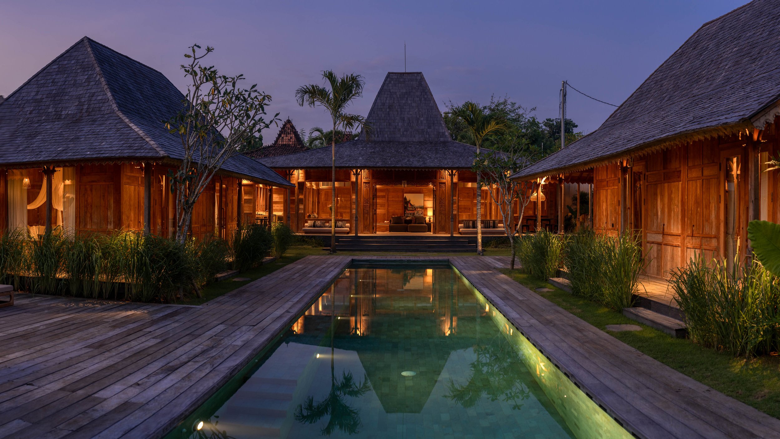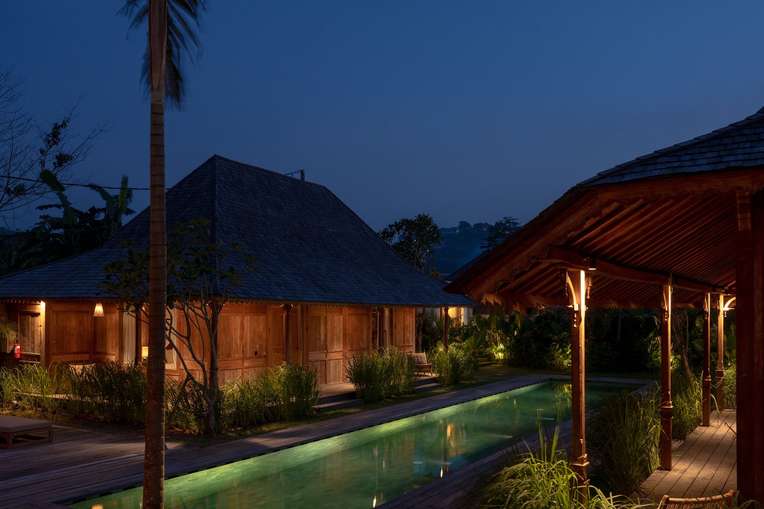 Outdoors, an impressive 18-meter swimming pool stretches through a lush garden setting, complemented by sun loungers and a warm wooden terrace—ideal for soaking up the tropical sunshine. The open garden space also lends itself perfectly to morning yoga or quiet meditation surrounded by nature.