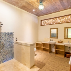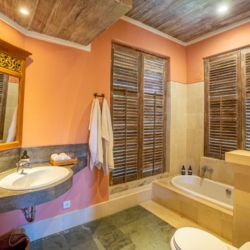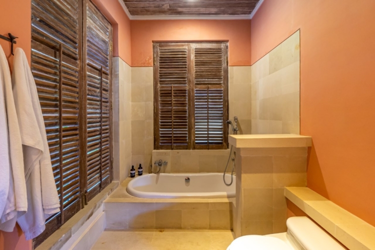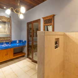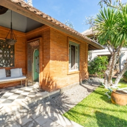 The surrounding garden is lush with native tropical plants and natural stone pathways, creating a serene outdoor setting that also features a relaxing jacuzzi. Just a short three-minute walk away lies Mertasari Beach, a beloved local spot and the venue for Bali’s annual kite festival.