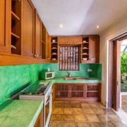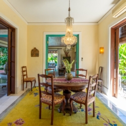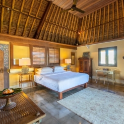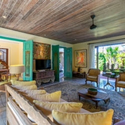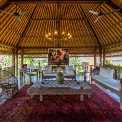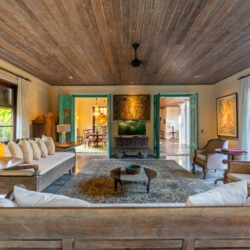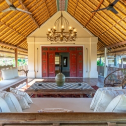 The architecture is defined by soaring thatched roofs and an open-plan layout that allows natural light and gentle breezes to move freely throughout the living spaces. Carefully curated antiques, art pieces, intricate wood carvings, and detailed stonework bring a sense of heritage to every corner of the home. Two spacious living areas—one on each level—provide comfortable settings for gathering or relaxing.