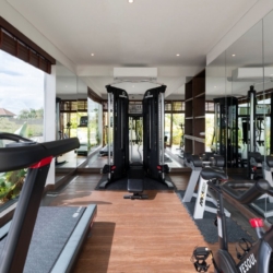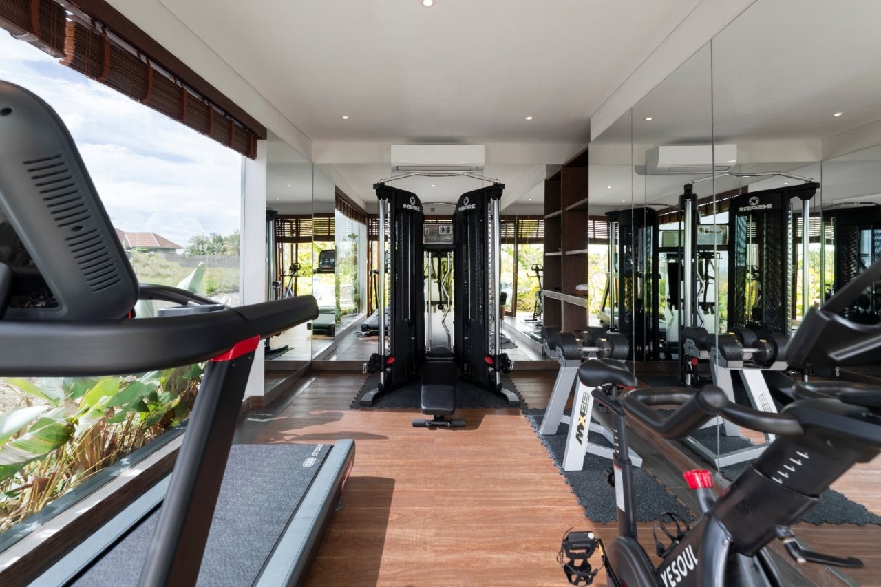 At the heart of the villa lies a spectacular 17-meter infinity pool, framing uninterrupted views across rice fields to the ocean beyond. Guests can unwind on the sea-view rooftop terrace, keep active in the private gym, indulge in the dedicated spa room, or choose between vibrant communal spaces and peaceful corners designed for quiet retreat.