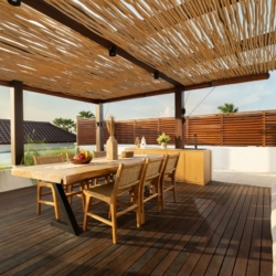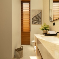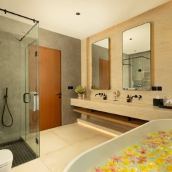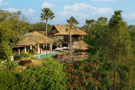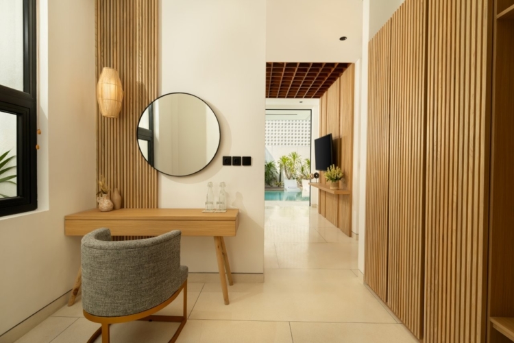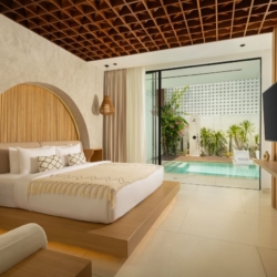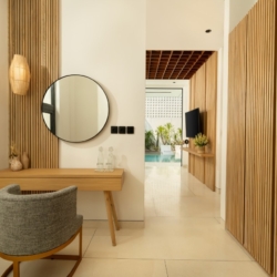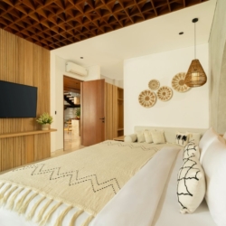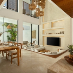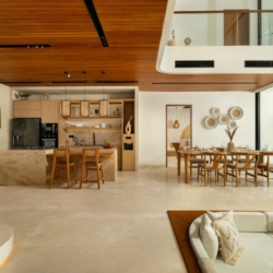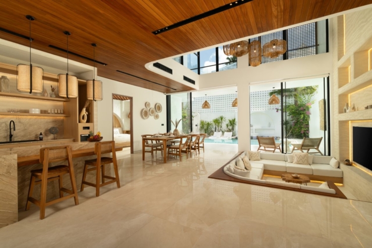 Fenta Villa is a thoughtfully designed three-bedroom retreat in Canggu, created by Lumbung Architect to blend traditional Balinese architecture with a modern tropical–bohemian aesthetic. Set on 300 square meters of land, the villa welcomes guests through a classic Angkul-Angkul entrance that opens into a warm, grounded living environment defined by natural materials such as wood and fossil stone—evoking a sense of calm, balance, and understated luxury.