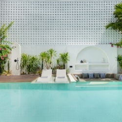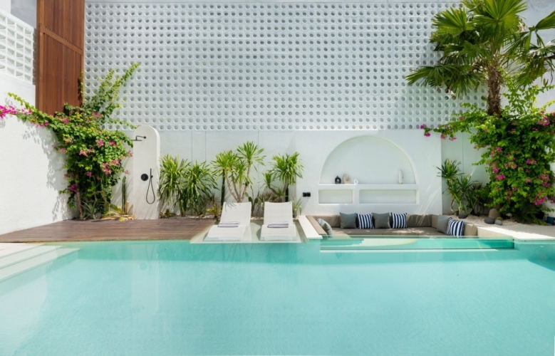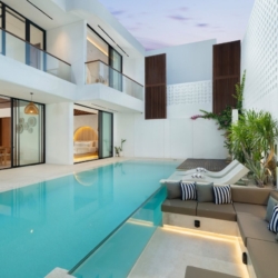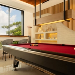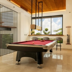 A billiard corner on the upper floor adds a casual, social element to the villa, while outdoors, a long swimming pool stretches alongside the garden, framed by sun loungers ideal for unhurried afternoons. Above it all, a breezy rooftop terrace offers another setting to dine, relax, or enjoy sunset views.