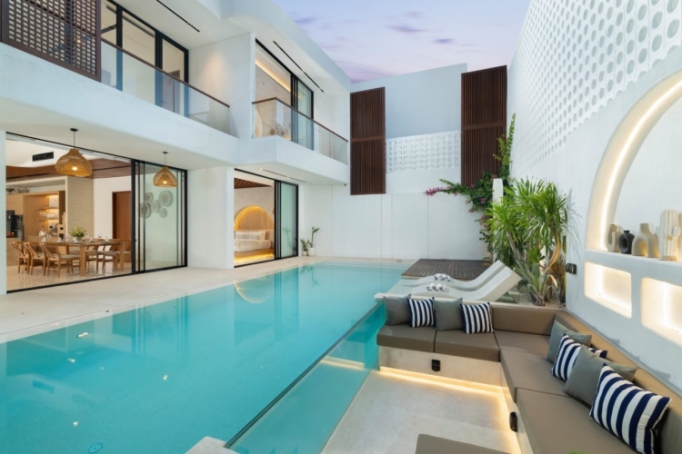 The ground-floor master bedroom features a dedicated workspace, an en-suite bathroom, and a soothing bathtub for moments of relaxation. Upstairs, two additional bedrooms each include their own en-suite bathroom, work desk, and access to a shared balcony overlooking the pool. The open-plan ground level brings together a fully equipped kitchen, dining area, and a sunken living room that flows seamlessly toward the pool, creating an inviting space for connection and leisure.