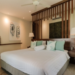 Each bedroom is designed as a private retreat, with large windows opening to calming views of the surroundings. The master suite elevates the experience with a spa-inspired bathtub, ideal for unwinding after a day in the sun. Outdoors, a sparkling swimming pool is framed by tropical greenery, creating a peaceful sanctuary for relaxation.
