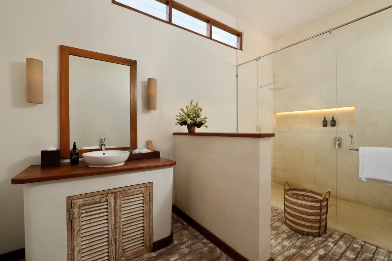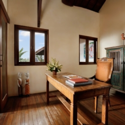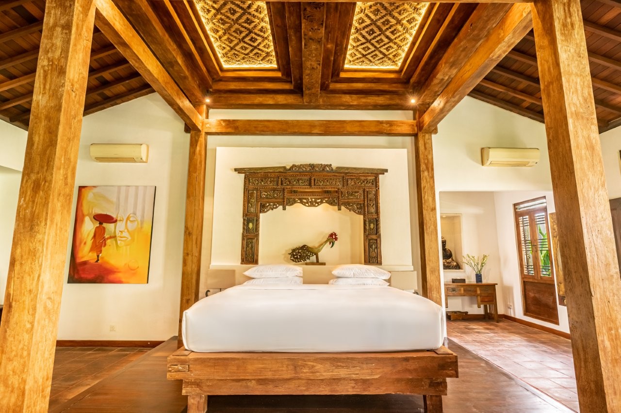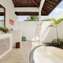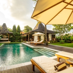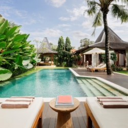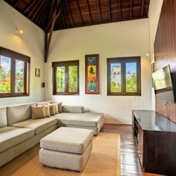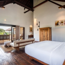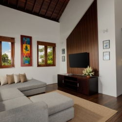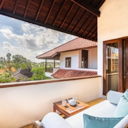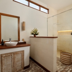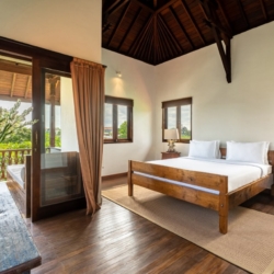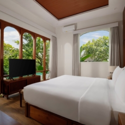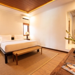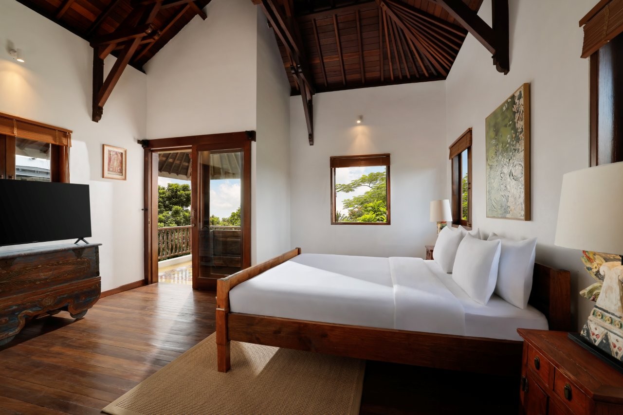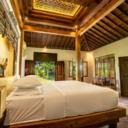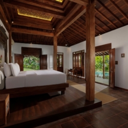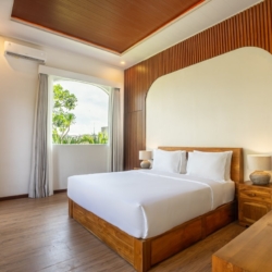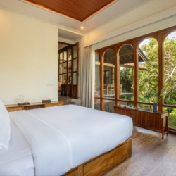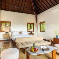At its heart, an open-plan living space unites the lounge, dining area, and kitchen beneath a beautiful Joglo pavilion, creating a natural flow for relaxed gatherings. Each bedroom is thoughtfully designed with warm wooden finishes, soft daylight, and en-suite bathrooms, forming a peaceful personal sanctuary. Some rooms open directly onto the garden, while others feature sunlit balconies overlooking the pool—each in harmony with the villa’s serene tropical rhythm.