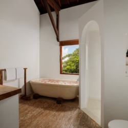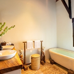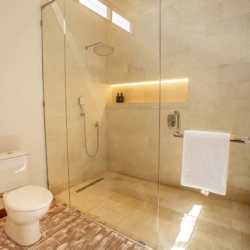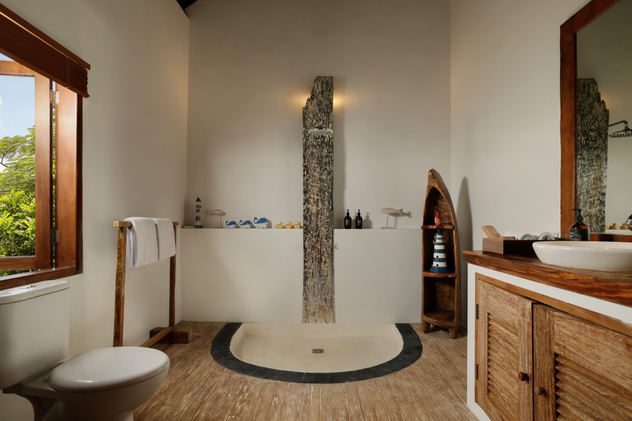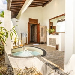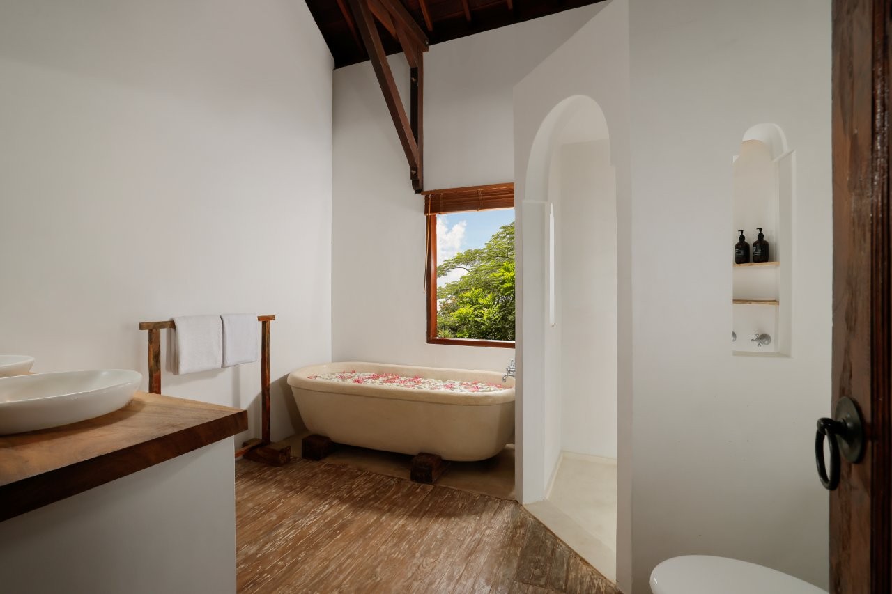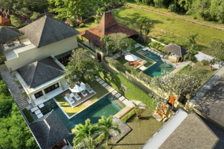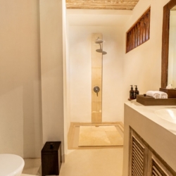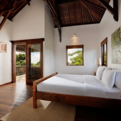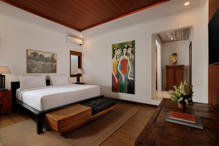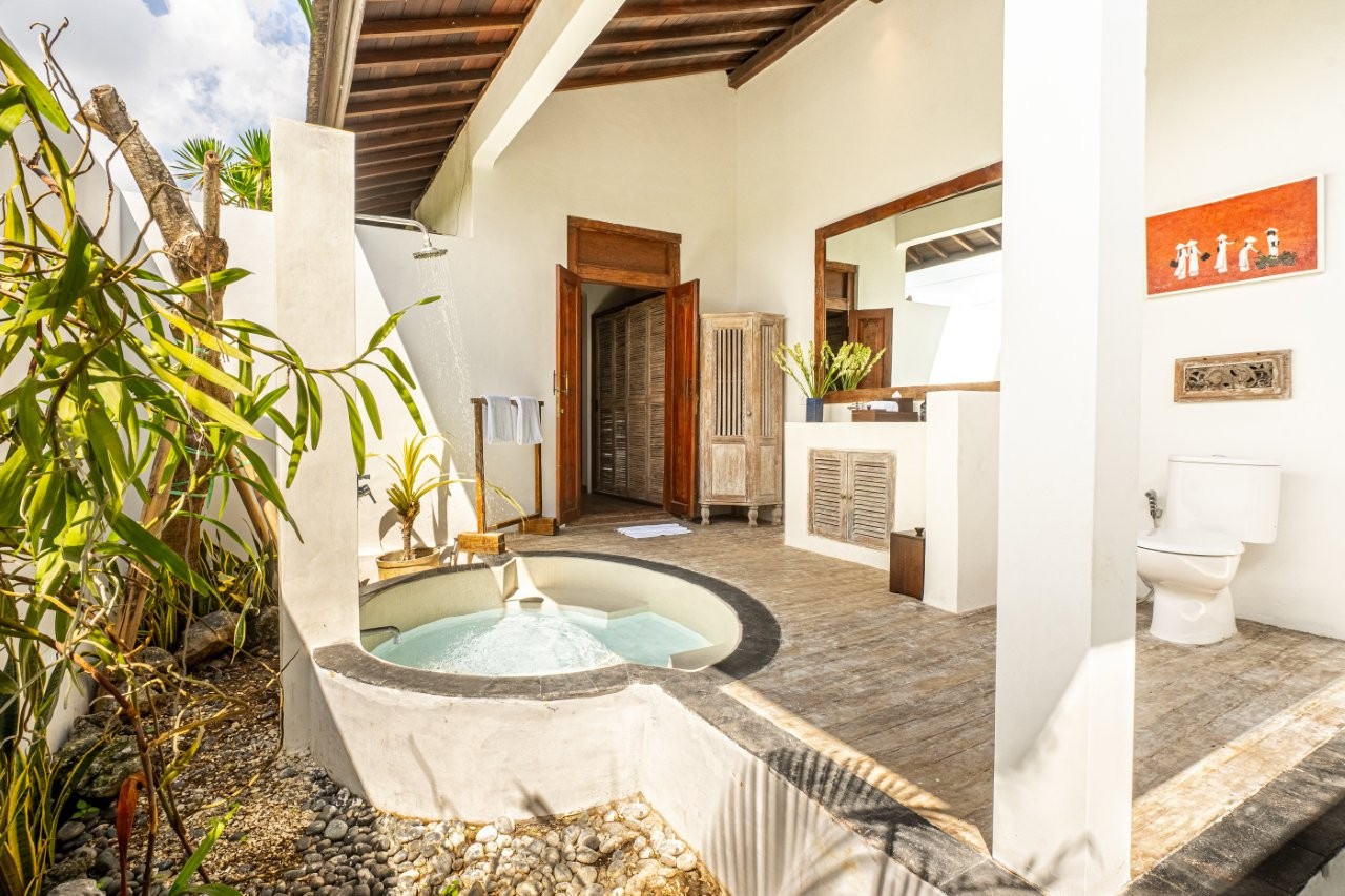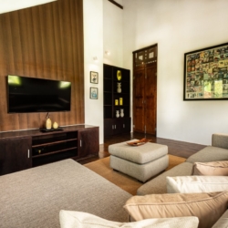 At its heart, an open-plan living space unites the lounge, dining area, and kitchen beneath a beautiful Joglo pavilion, creating a natural flow for relaxed gatherings. Each bedroom is thoughtfully designed with warm wooden finishes, soft daylight, and en-suite bathrooms, forming a peaceful personal sanctuary. Some rooms open directly onto the garden, while others feature sunlit balconies overlooking the pool—each in harmony with the villa’s serene tropical rhythm.