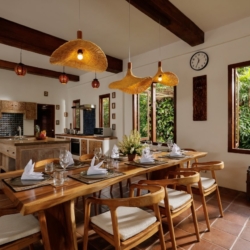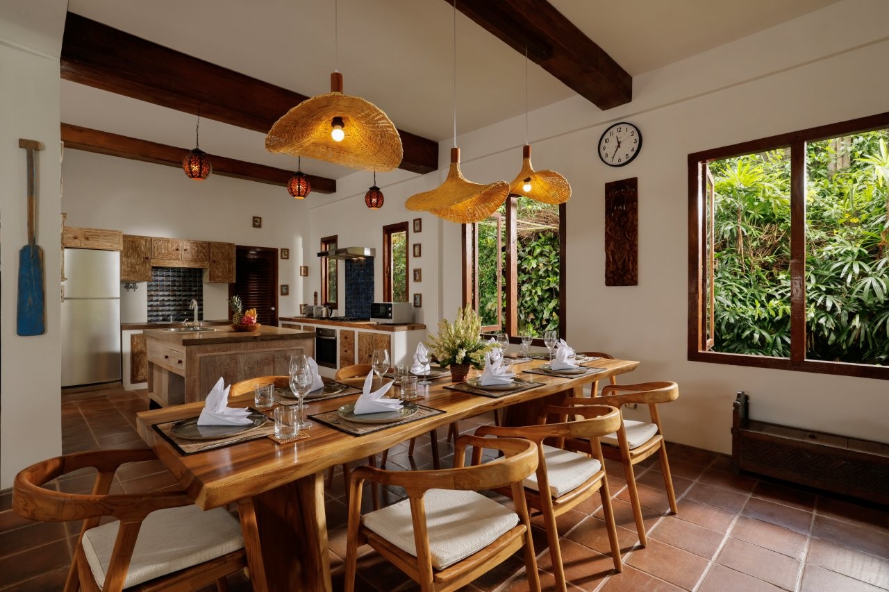 Indoors, a handcrafted wooden dining table sets the scene for slow mornings and shared meals. The kitchen pairs natural textures with modern functionality, while the living area extends into a cozy reading nook for quiet moments of reflection. Large windows frame the surrounding greenery, inviting light and gentle breezes throughout the day.
