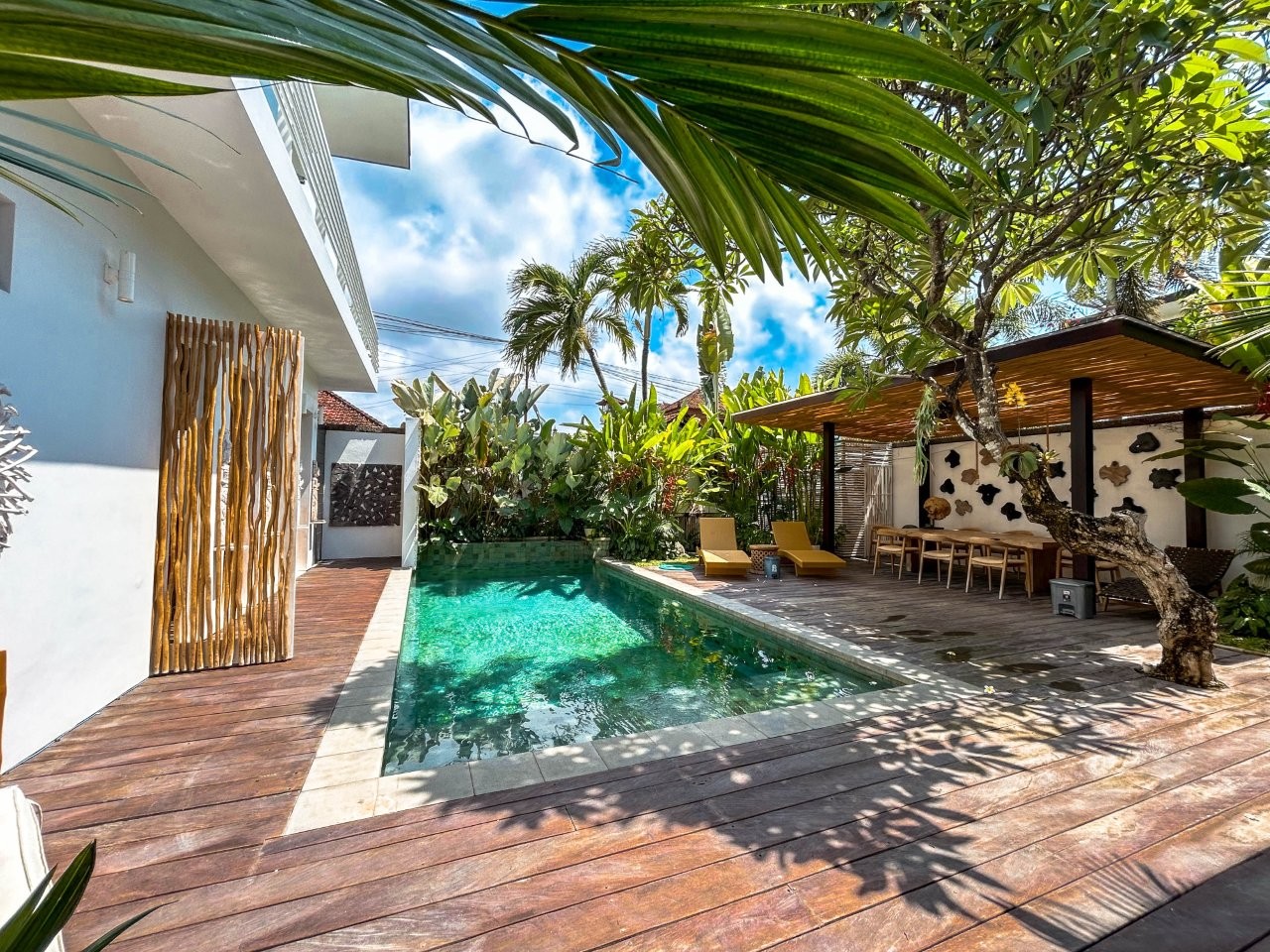 At the entrance, a private outdoor swimming pool is surrounded by sun loungers and a comfortable lounge area that accommodates up to eight guests, all framed by lush tropical greenery. The villa’s open-plan design seamlessly connects indoor and outdoor living spaces, enhancing the sense of relaxation and connection with nature.