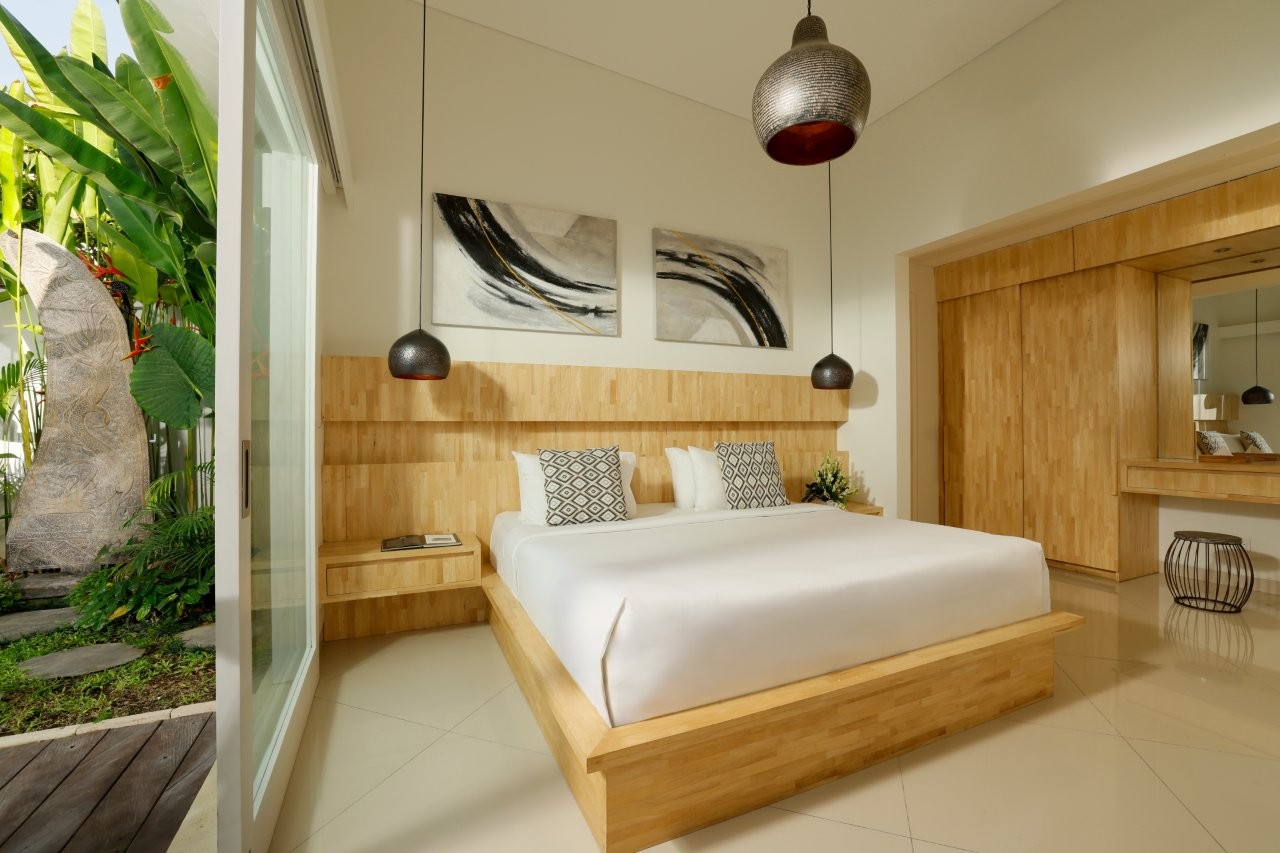 Outdoors, the spacious pool area is bordered by vibrant plants and garden textures, creating an inviting setting for quiet afternoons under Bali’s warm sun. Throughout the villa, clean lines and a refined minimalist aesthetic shape a tranquil environment, making The Suar Sanur an ideal escape for travelers seeking comfort, privacy, and effortless island living.