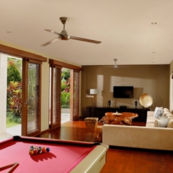 At the heart of the villa, a bright living room flows seamlessly into the dining area, forming a welcoming social hub for shared meals, long conversations, and laughter that stretches into the evening. The modern kitchen is fully equipped for everything from casual breakfasts to chef-prepared dinners. For relaxed entertainment, a dedicated media room features a billiards table, deep seating, and a television—ideal for movie nights, friendly games, or unwinding after a day out.