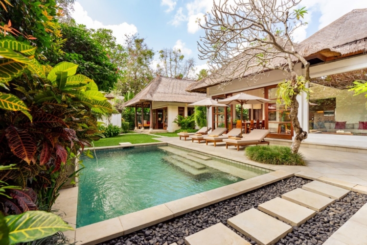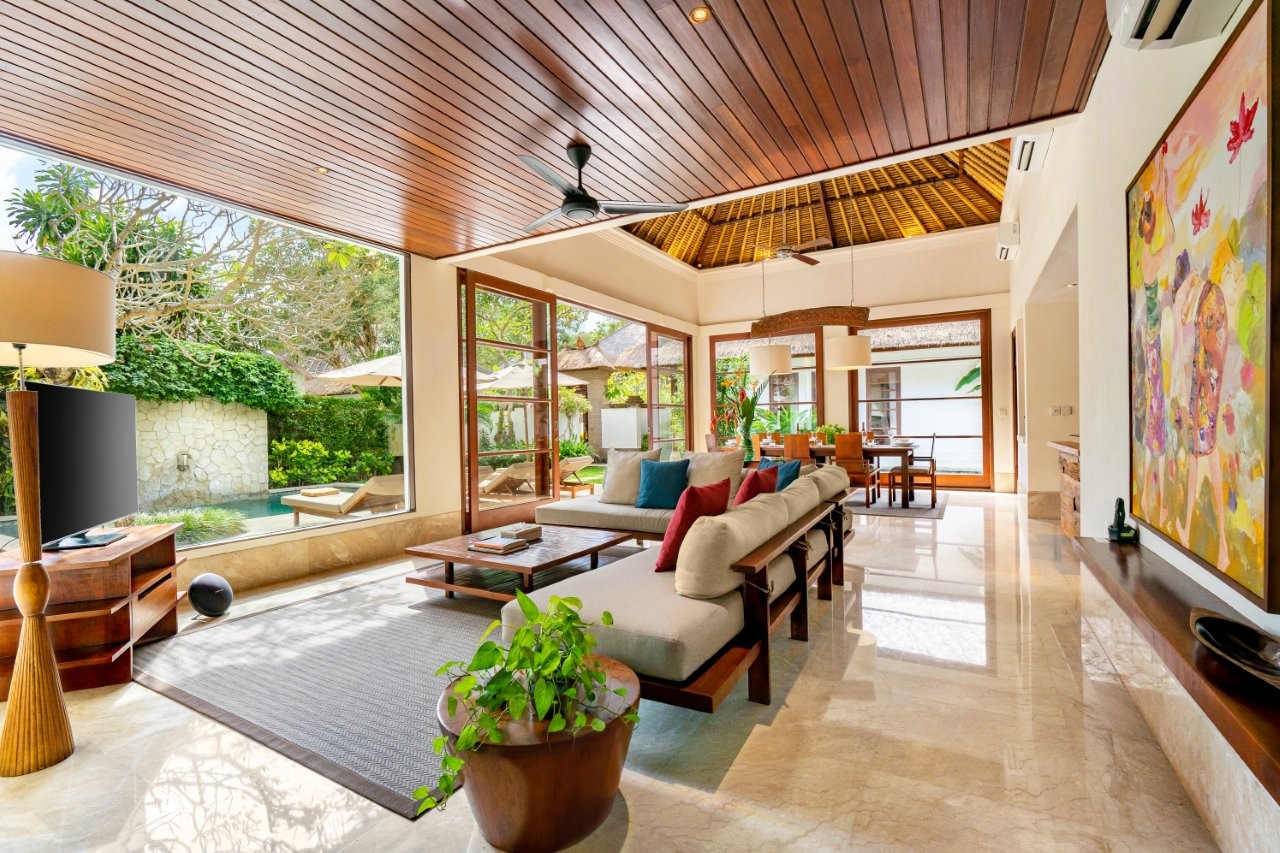 Outdoors, a private swimming pool sits amid lush greenery, perfect for refreshing daytime swims or peaceful evening dips. Sun loungers line the poolside for soaking up the tropical warmth, while a cozy garden sofa offers a tranquil corner for reading or unwinding. Just minutes away, Jimbaran’s renowned seafood dining and golden-sunset beaches add a touch of local flavor and easy exploration to your stay.