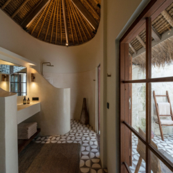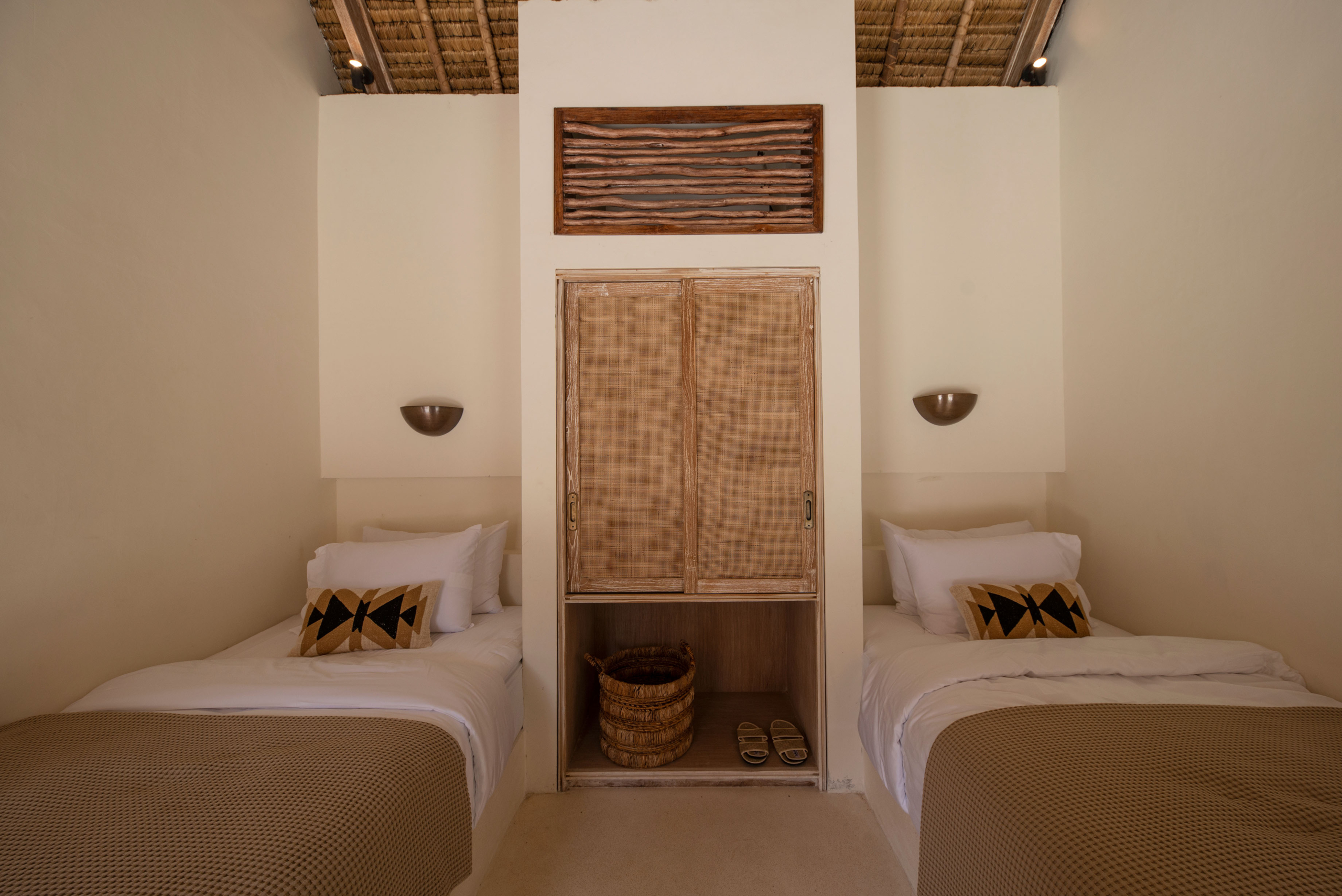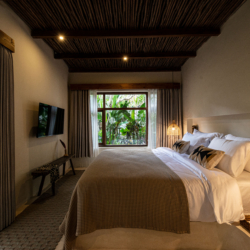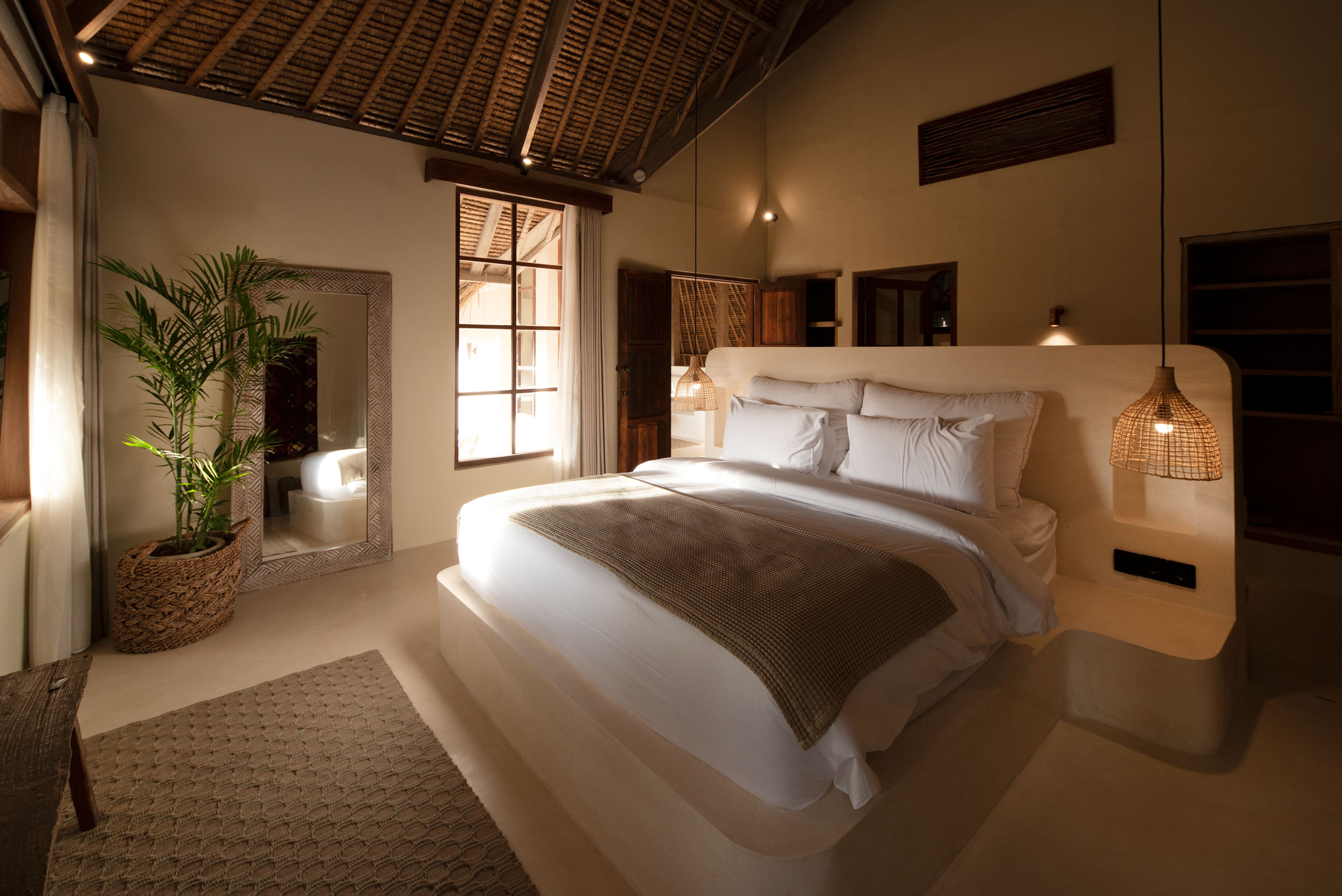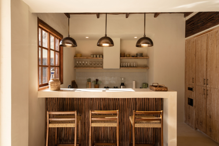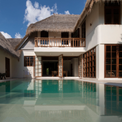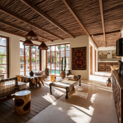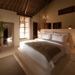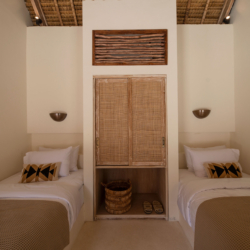 Three bedrooms are located in the main building and open directly toward the pool, allowing gentle morning light and the calming sound of water to shape each day. A fourth bedroom, set within the pool house, provides a more secluded option with twin beds and its own outdoor bathroom—perfect for added privacy.