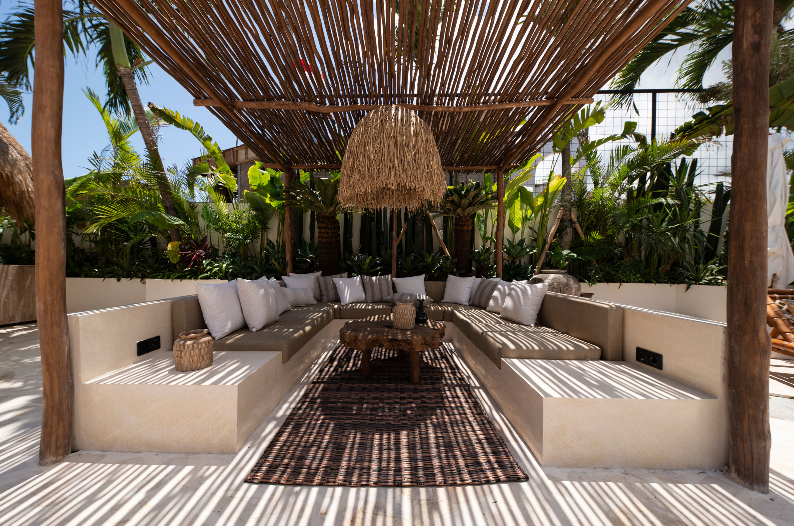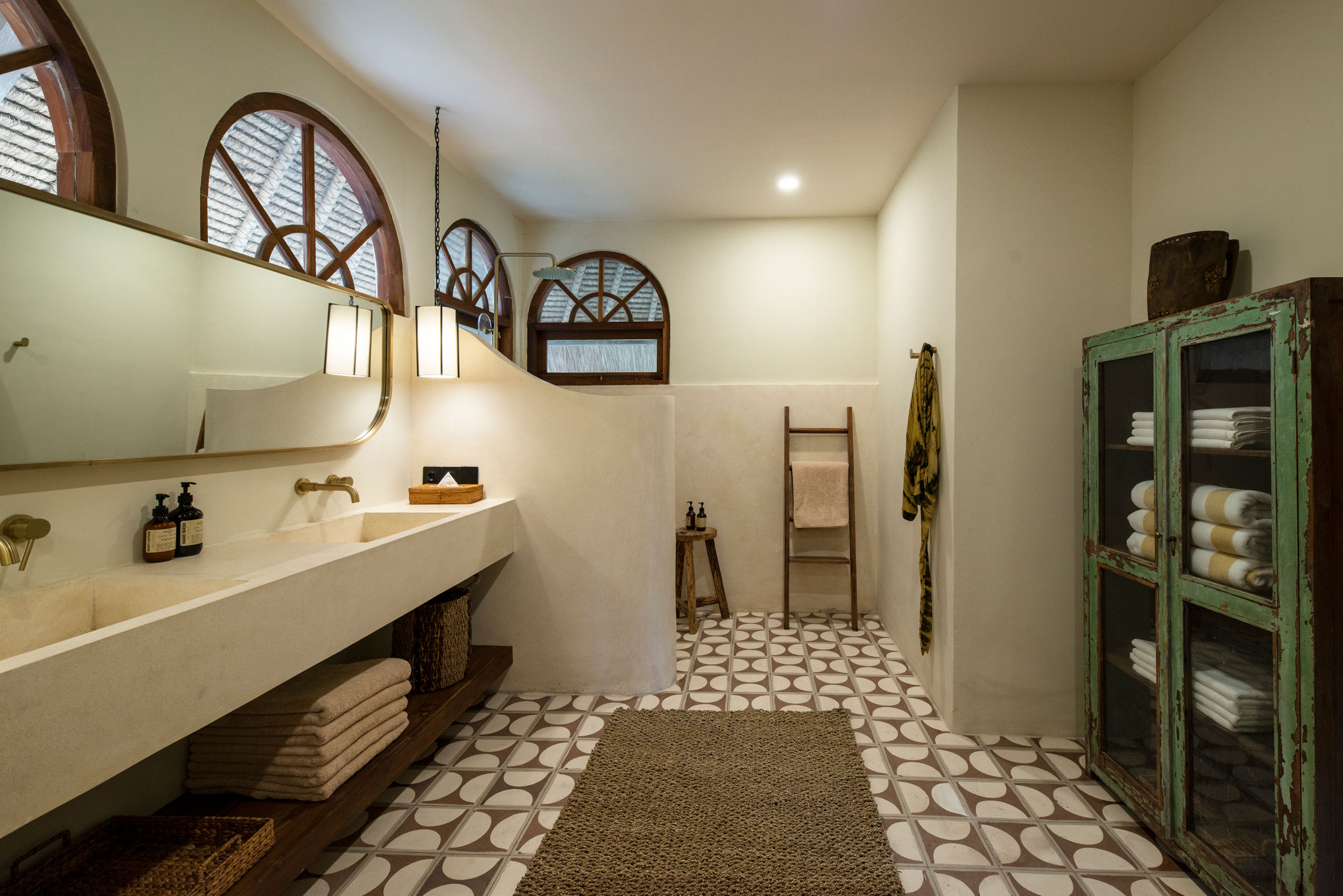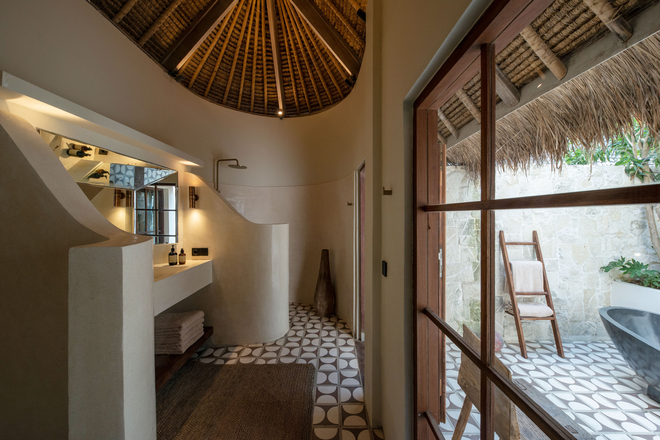 Three bedrooms are located in the main building and open directly toward the pool, allowing gentle morning light and the calming sound of water to shape each day. A fourth bedroom, set within the pool house, provides a more secluded option with twin beds and its own outdoor bathroom—perfect for added privacy.