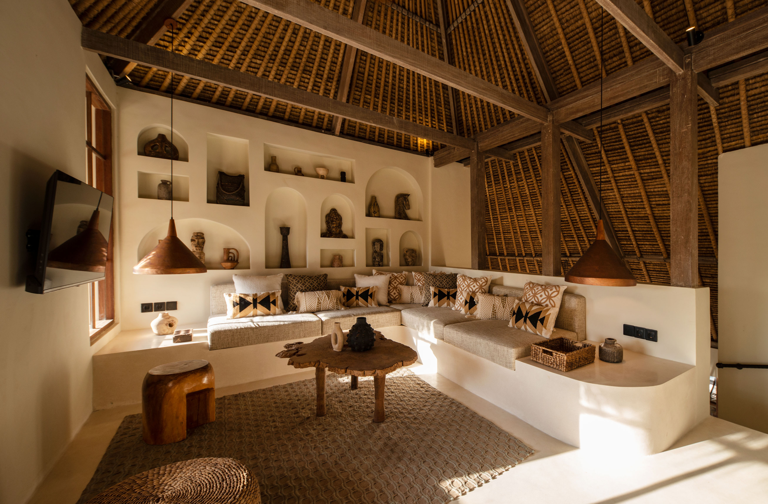 Indoors, the kitchen and dining area flow seamlessly into one another, creating an inviting space for cooking, gathering, and unwinding together. Wide sliding doors allow the villa to open fully to Bali’s soft breezes or be closed for cool, quiet comfort. The main living room showcases Villa Xanadu’s signature bohemian style, layered with warm textures and a cozy, welcoming feel. Upstairs, a second living area offers a quieter nook ideal for reading or relaxed downtime.